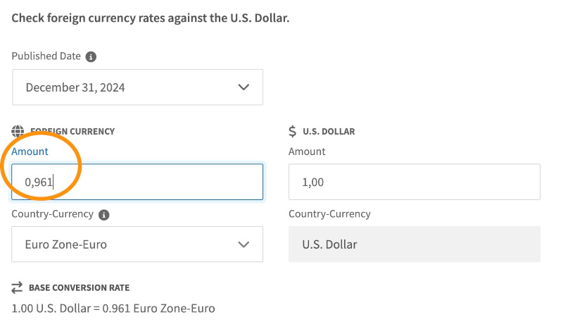 On the Treasury page, you can see that the Treasury reporting rate of exchange USD/EUR is 0.961 for December 31st, 2024.