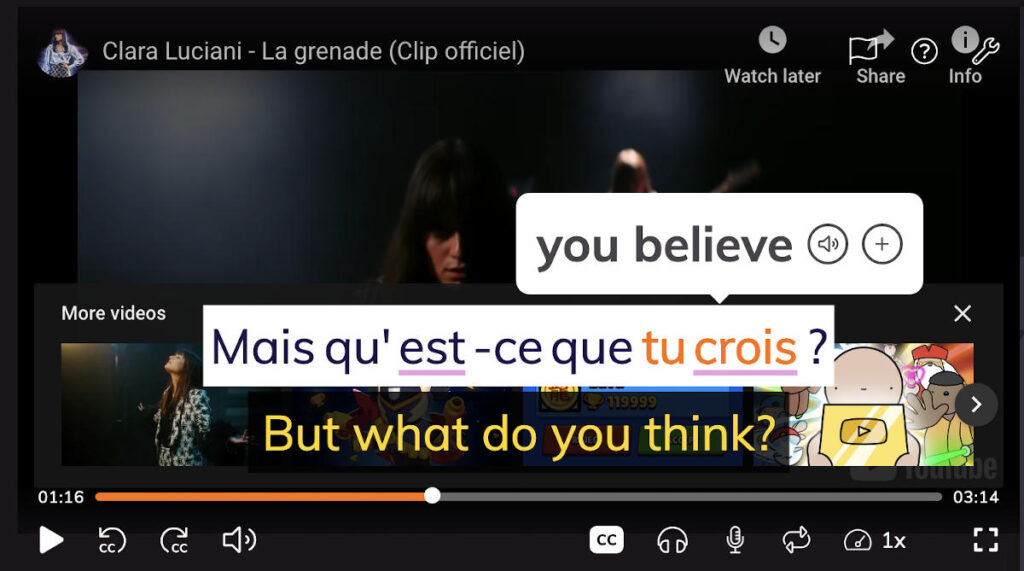 With a yearly subscription, Lingopie is very affordable at €5.99/month and you can take advantage of Lingopis’s 7-day free trial. The yearly plan also gives you access to other languages: Spanish, Russian, Portuguese, German, Italian, Korean and Japanese.