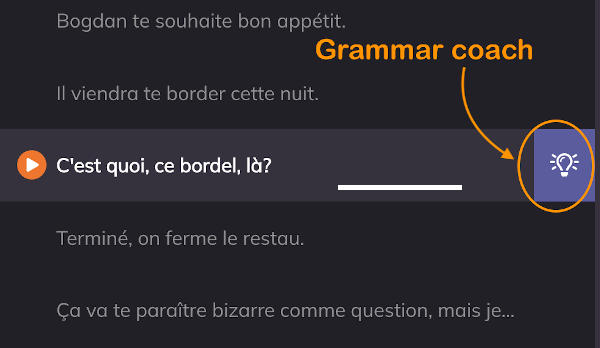 When you need more explanation about a sentence on the screen, go to the Grammar tab in the right-hand side or click on the lightbulb on the far right to bring up the grammar coach.