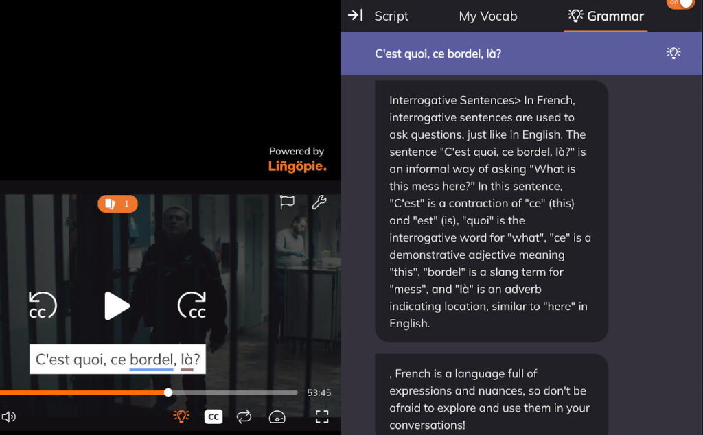 Learning with Lingopie is fun because you combine watching real shows and being able to interact with subtitles to understand what’s on your screen. You get to learn French with native speakers who use real spoken French, not academic French that you learn in books. This is a chance to learn a great deal of idioms as well as slang vocabulary that French use on a daly basis.