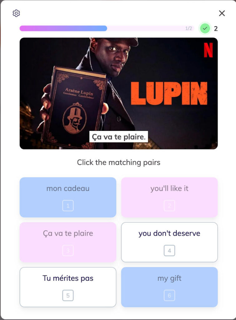 The Lingopie interface looks a lot like Netflix, therefore it feels immediately familiar. When you watch a movie or a show, you can have the script displayed on the right hand-side of the screen while subtitles appear at the bottom of the screen in both French and English. Here’s a scene from the famous French show Lupin that I’m watching on my computer.